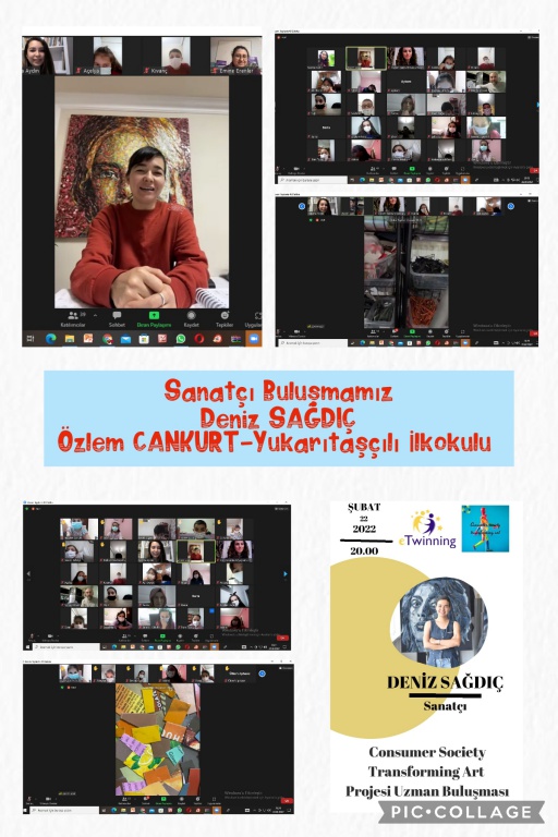 Okulumuz 3/A Sınıfı öğrencileri ve öğretmenleri Özlem CANKURT Tüketen Dünya, Dönüşen Sanat/ Consumer Society, Transforming Art eTwinning projesinde Sanatçı Deniz SAĞDIÇ ile 22.02.2022 tarihinde çevrimiçi olarak buluştu. Atık malzemeler kullanarak eserlerini oluşturan sanatçı Deniz SAĞDIÇ önce sanatı hakkında çocuklara bilgiler verdi. Daha sonra çocuklarla soru cevap yaparak merak ettikleri konularda onlarla içtenlikle sohbet etti. Sanatçı Deniz SAĞDIÇ'a bu güzel buluşma için teşekkür eder, projede emeği geçen herkese başarılar dileriz.